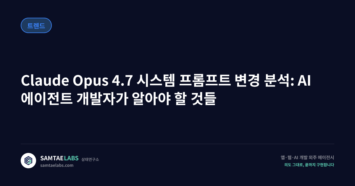 Claude Opus 4.7(2026년 4월 16일 출시)의 시스템 프롬프트 변경은 단순한 문구 수정이 아니다. Anthropic이 AI 에이전트를 어떤 방향으로 설계하려는지, 그 철학적 전환이 텍스트로 드러난 결과물이다. Simon Willison이 Opus 4.6(2026년 2월 5일)과 4.7의 시스템 프롬프트를 Git diff 방식으로 비교 분석해 공개했고, 이 내용은 AI 에이전트 개발 실무에 직접적인 시사점을 던진다.