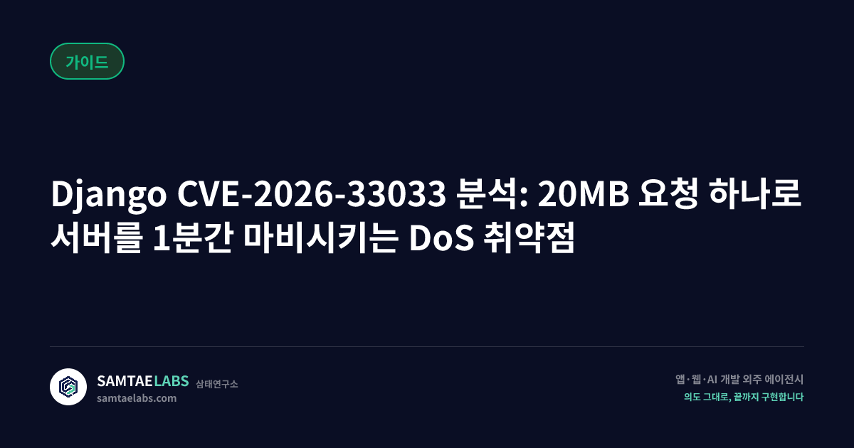 CVE-2026-33033은 Django의 MultiPartParser에서 발견된 사전 인증(Pre-Auth) DoS 취약점이다. 파일 업로드 기능을 제공하는 서비스라면 물론이고, 그렇지 않은 서비스라도 Django 기본 설정을 그대로 쓰고 있다면 이 취약점에 노출된다.