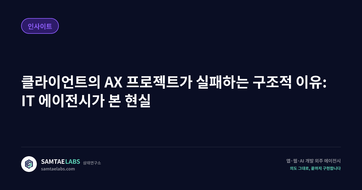 엔터프라이즈 AX(AI 전환) 프로젝트는 IT 에이전시 입장에서 가장 까다로운 유형의 의뢰 중 하나다. 기술적으로 완성도 있는 결과물을 납품해도, 클라이언트 조직이 그것을 받아들일 준비가 안 되어 있으면 프로젝트는 조용히 사장된다. 최근 AI 에이전트 개발 의뢰가 급증하면서, 우리가 목격하는 실패 패턴도 점점 선명해지고 있다.
