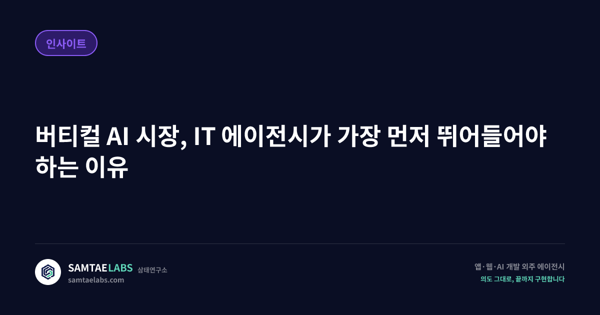 버티컬 AI란 특정 산업의 업무 흐름 전체를 대체하도록 설계된 AI 시스템을 말한다. 지금 IT 개발 에이전시 앞에는 조용하지만 거대한 기회가 열려 있다. 대형 플랫폼 기업이 외면하는 산업, 파편화된 시장, 레거시 시스템이 뒤엉킨 복잡한 운영 환경—바로 이 조건들이 에이전시에게는 진입 장벽이 아니라 경쟁 우위가 된다.